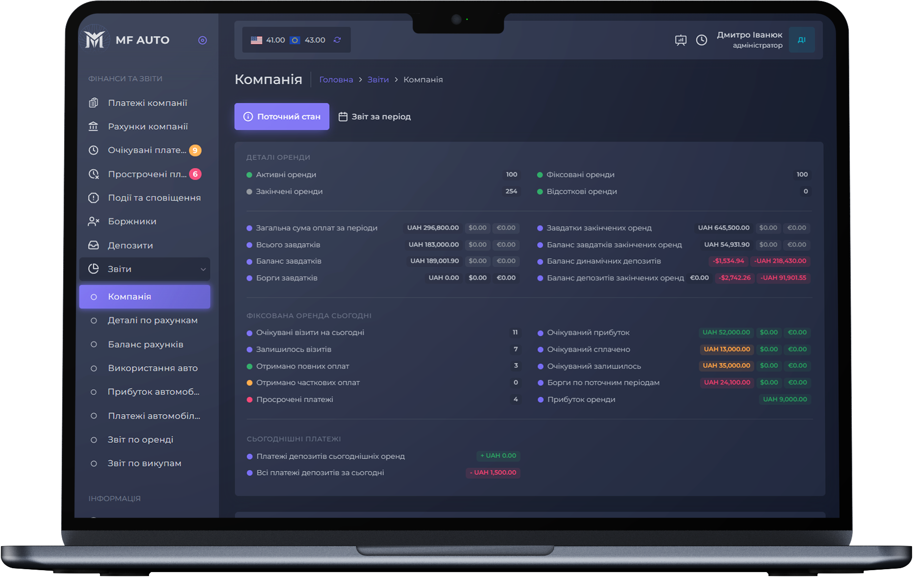 This report is created for company owners. It allows you to quickly view the current status of the company.