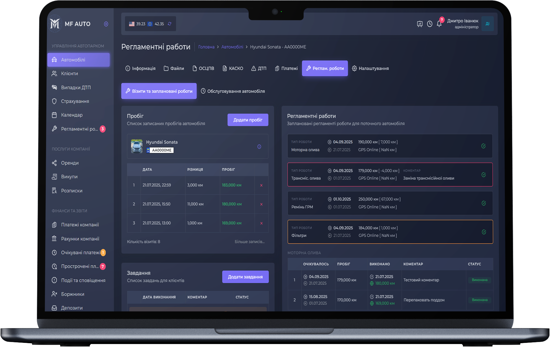 The functionality of maintenance work can be used as an autonomous module related to vehicles, as well as related to the Repair module, which allows you to view scheduled work, record mileage, and control work execution.